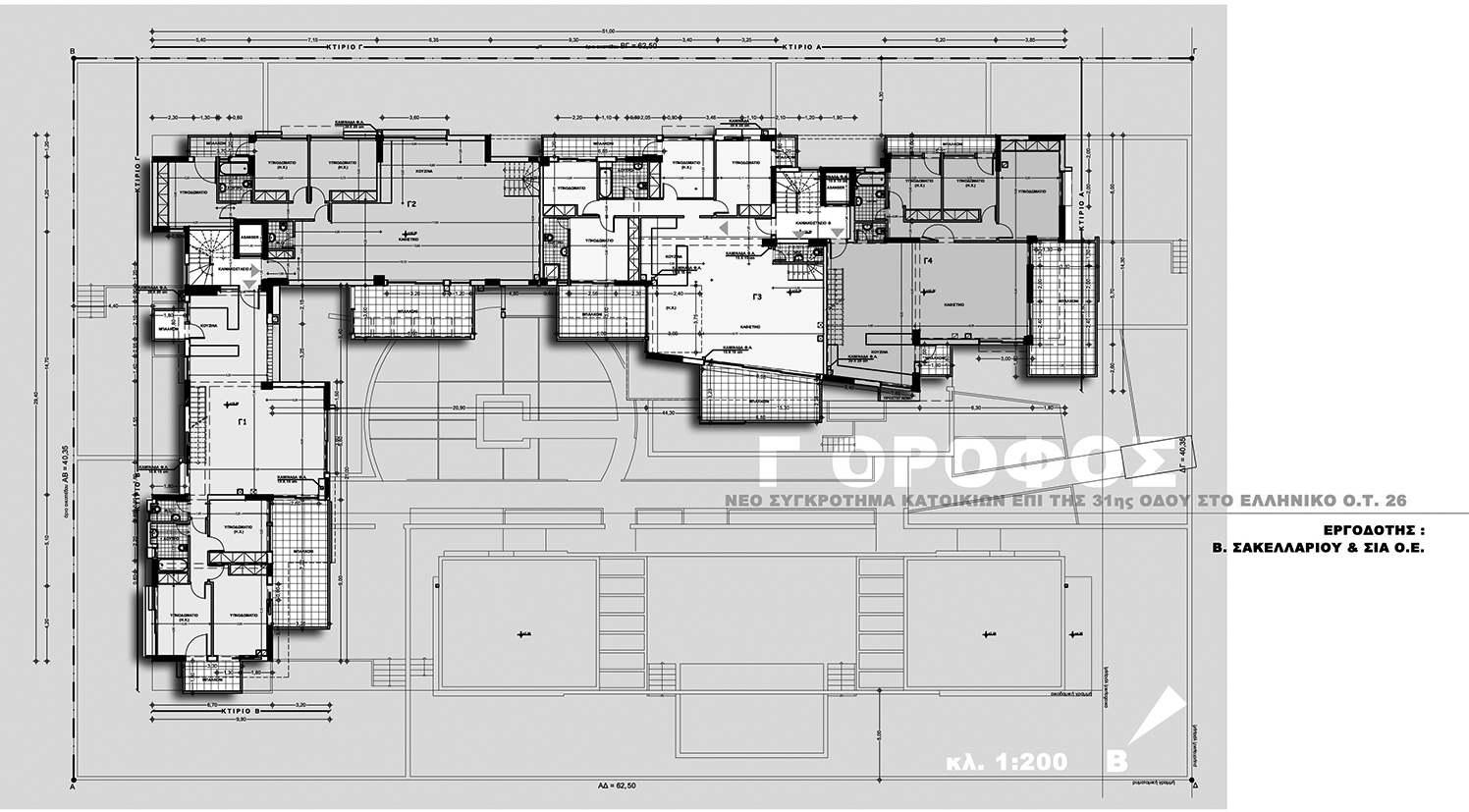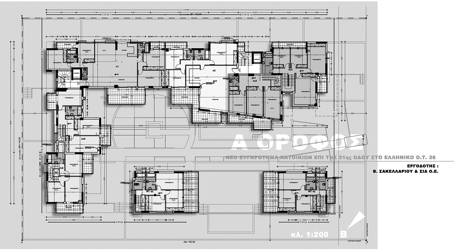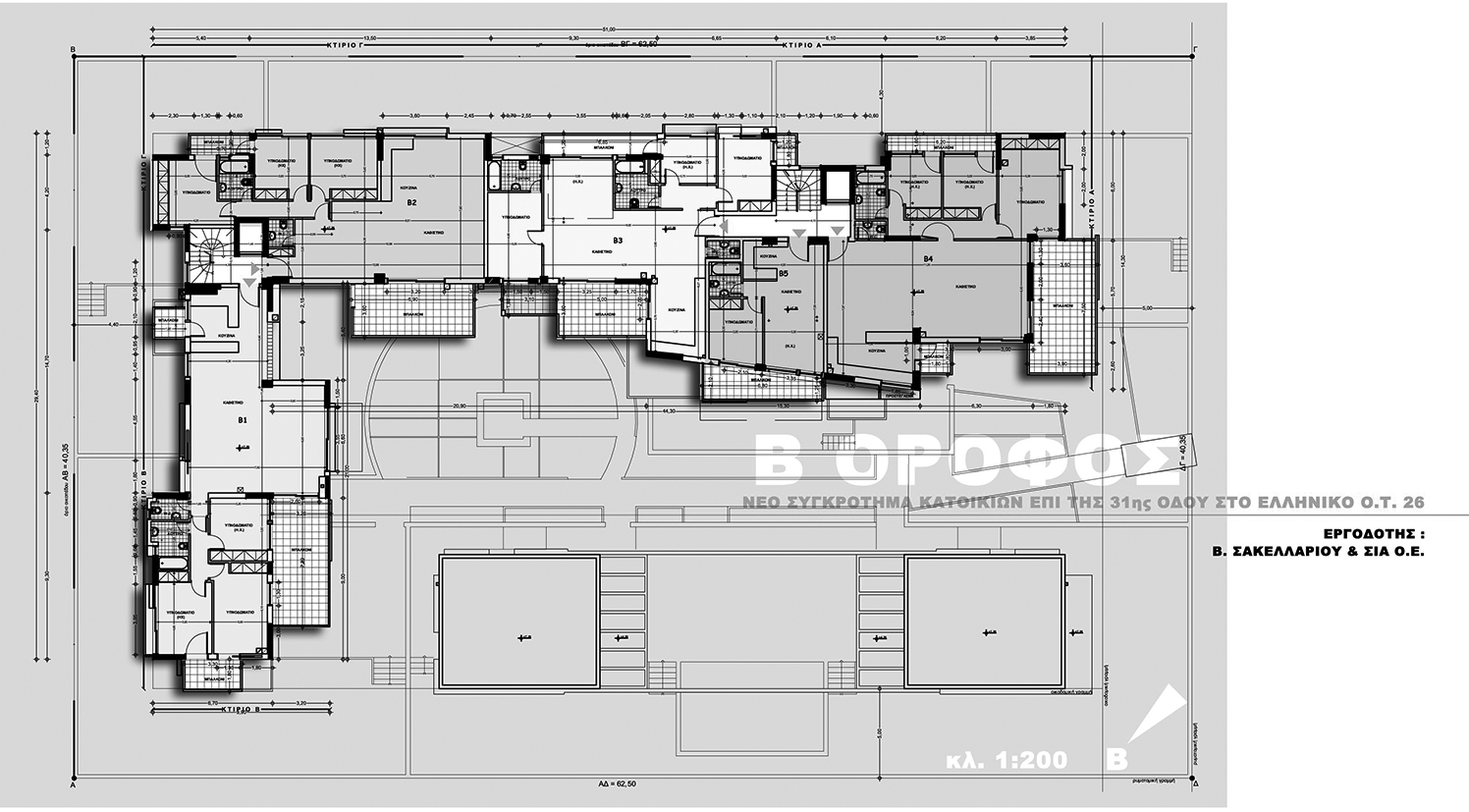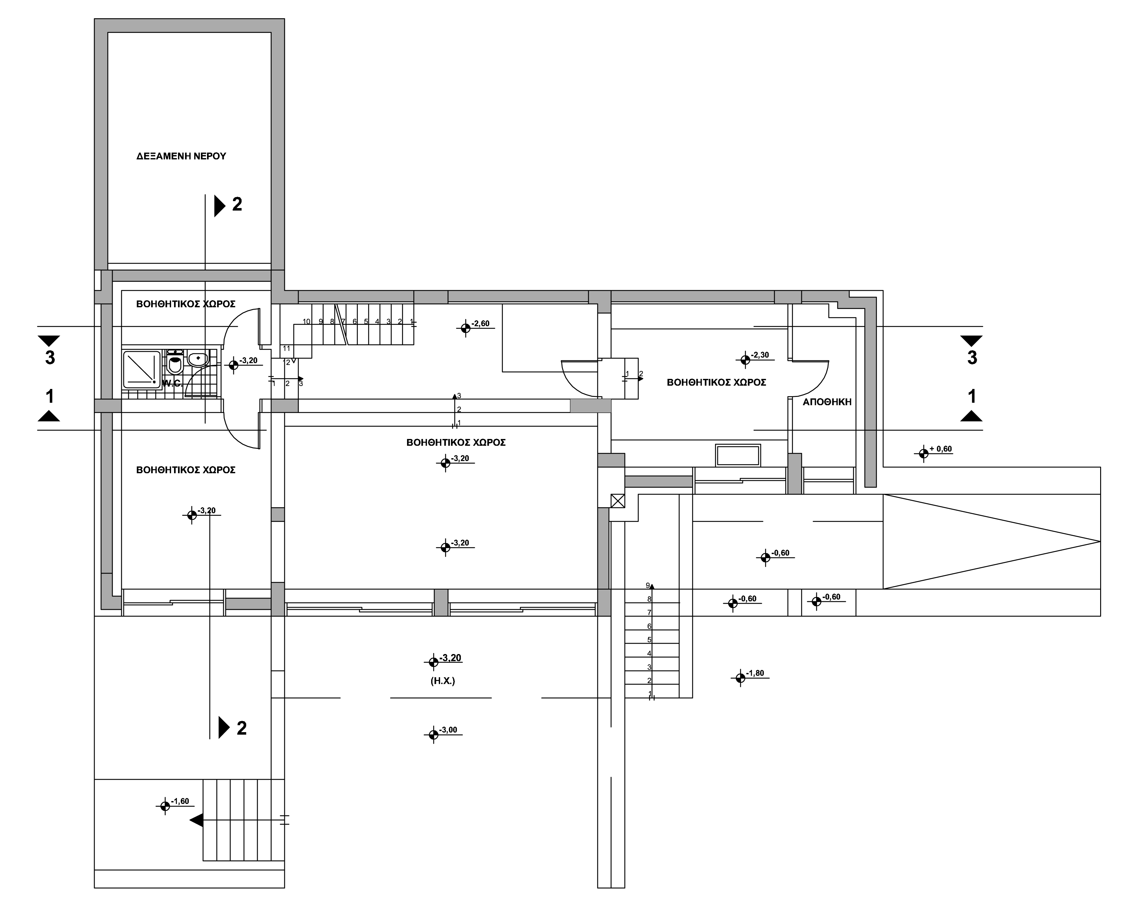 BUILDING PLAN SUMMARY Each part (unit A’B’C’) of the complex concerns a residence that is developed in levels. The residence includes a living room and bathroom on the ground floor, while the upper level includes a bedroom. The basement is structured into auxiliary spaces. Also, each residence has a separate underground space with a closed water collection tank in contact with it.