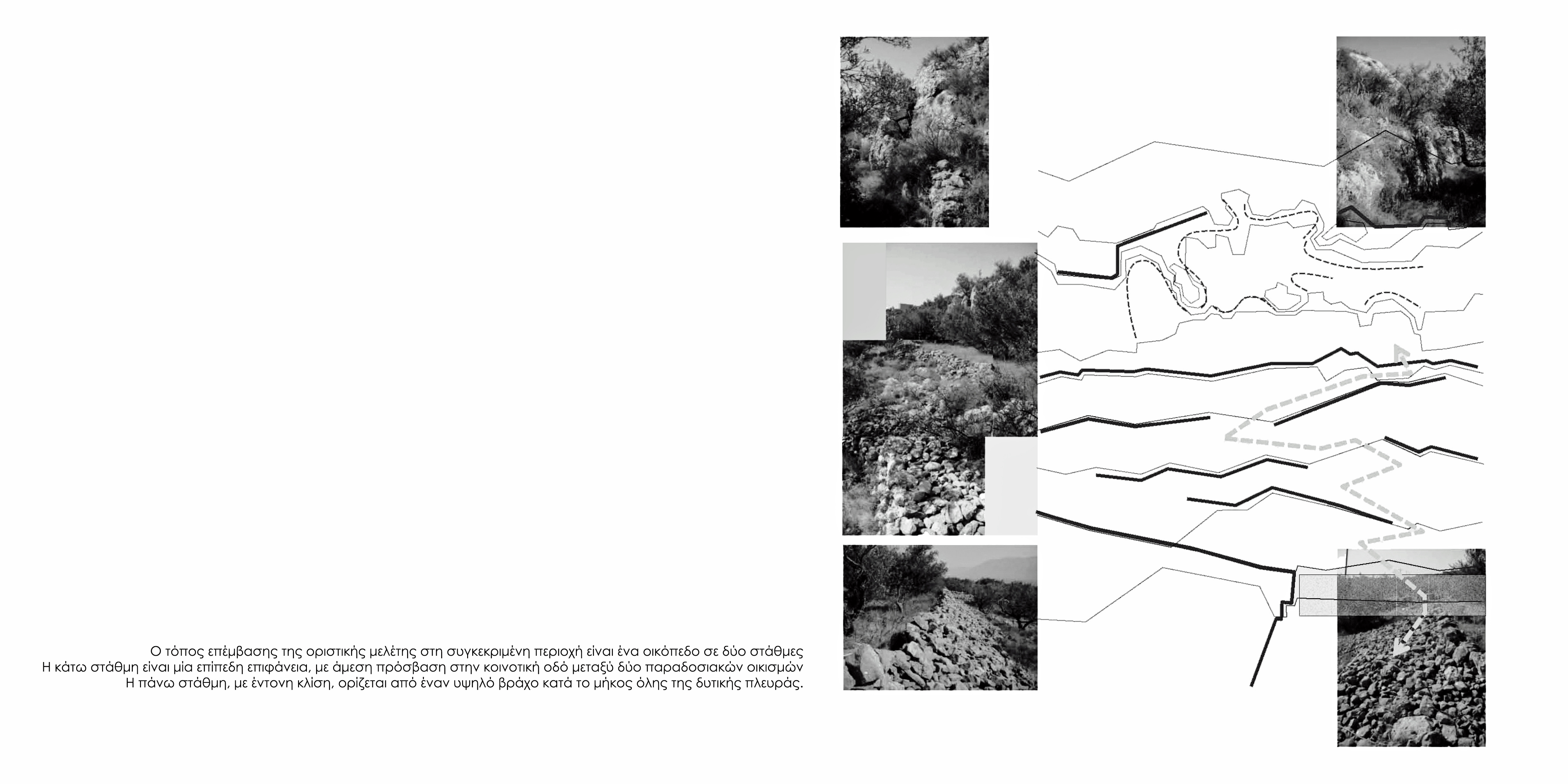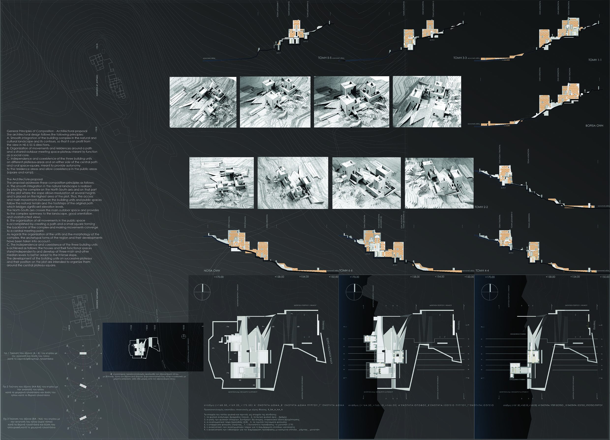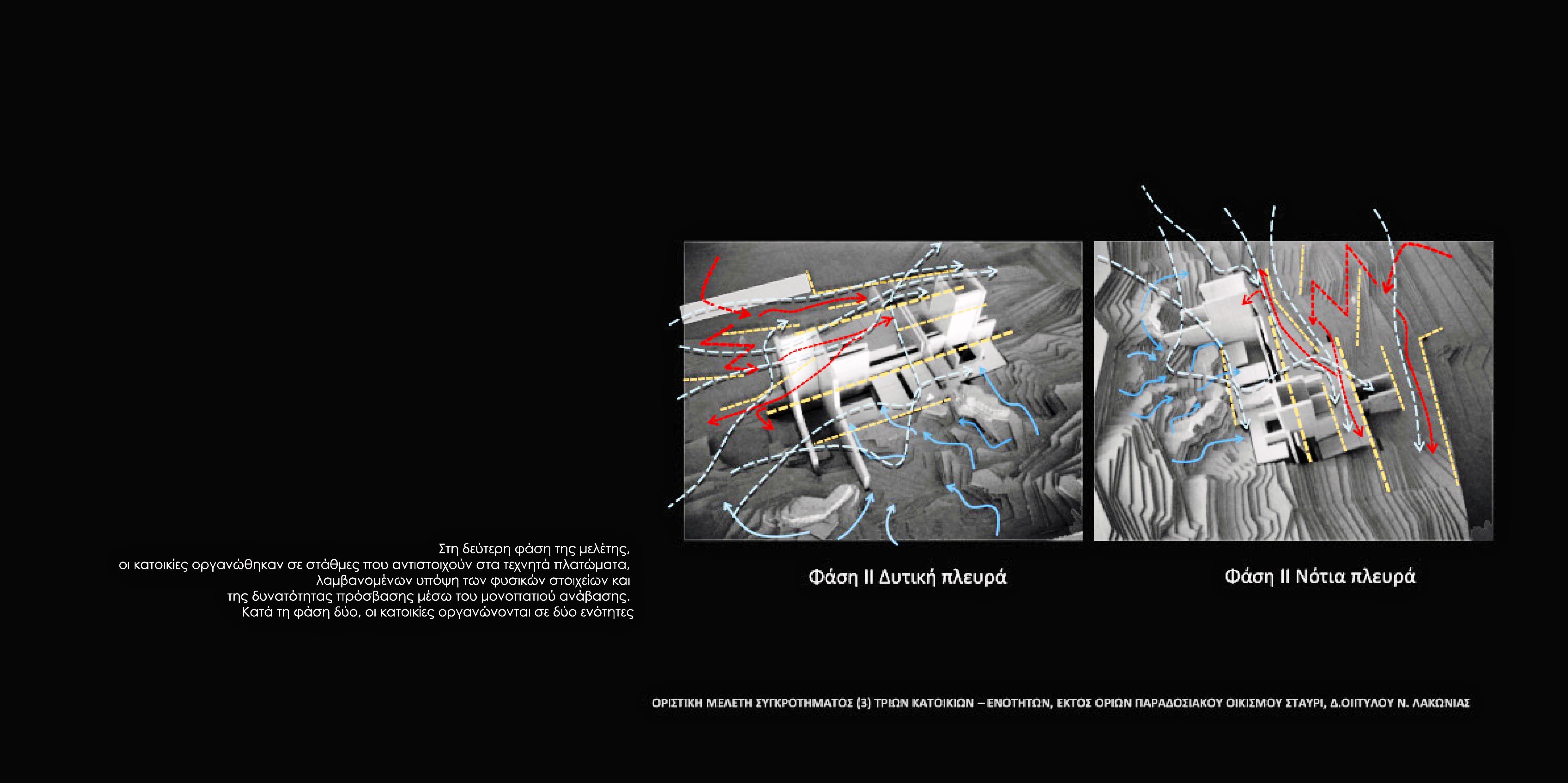 ANALYSIS OF THE BASIC PRINCIPLES OF COMPOSITION In this study the elements of the landscape, natural and artificial (see A3), constitute the elements of the composition. I mean the way in which the analemmatic drystone walls, which form the planting levels, can be reconstituted to form minimum habitation levels in a sloping field. The habitation can be organized on levels, corresponding to the artificial platforms, and divided into internal functional zones, taking advantage of the view towards the olive groves and the wider landscape. General Principles of Composition of the Complex – Architectural Proposal. The architectural design follows the following principles of composition: A. Smooth integration of the complex into the natural and cultural landscape, as well as the elevational curves, so that the complex opens to the view with (NE_ΑSEΝ) orientation. B. Organization of movements and residences around a path and a common open-air meeting place plateau so as to form a social core. C. Autonomy and coexistence of the three units in different flat areas, on either side of the path and the central outdoor space, a square, in order to achieve: Autonomy of the three houses in the living areas and coexistence in the common areas (square and ramp). The architectural proposal. The proposal deals with the above construction principles as follows: A. The smooth integration into the natural landscape is implemented by positioning the complex along the north-south axis and in that part of the plot where the slope allows for differentiation according to ‘height, i.e., placed in the highest area. Thus, access and basic movement to the modules and common areas follow the natural terrain in the traces of the original path with significant elevation differences. The north-south axis penetrates the main outdoor space and offers complex visual contact with the landscape and openness to good orientation and unobstructed views. B. The condensation of all movements and actions is realized by the creation of the path and the small square that form the backbone of the complex and gather the movements and positions in the complex. For the organization and morphology of the complex, I took into account the evolution of the archetypal forms of the area. C. The autonomy and co-existence of the three units is realized as follows: The residences are built autonomously with the individual spaces on three levels and with the structure of the residence on medium levels to better adapt to the strong slope of the ground. The inclusion of the building units in consecutive height platforms, or analemmas, the purpose of which is to ultimately organize the units around the central platform, or square.