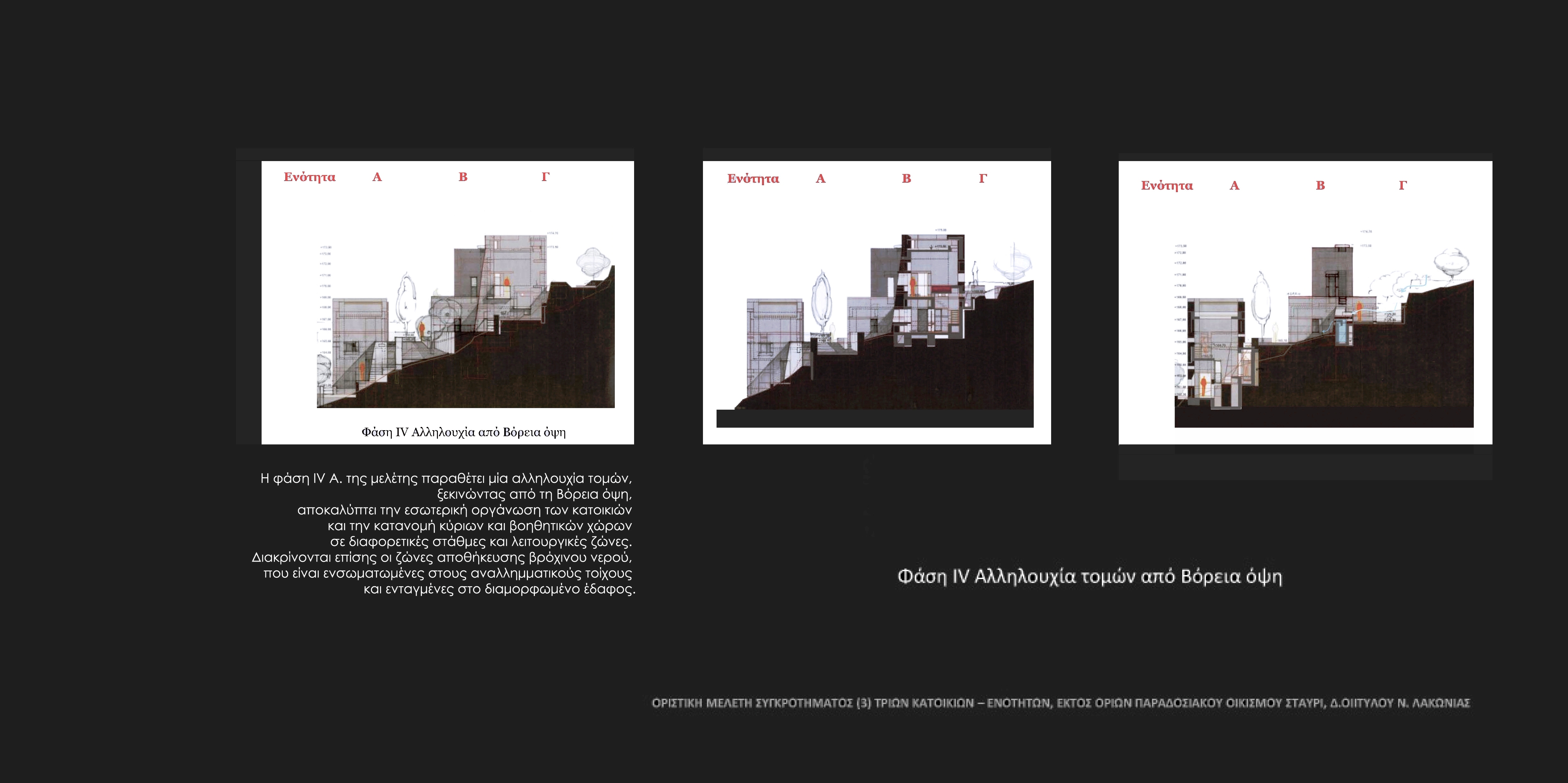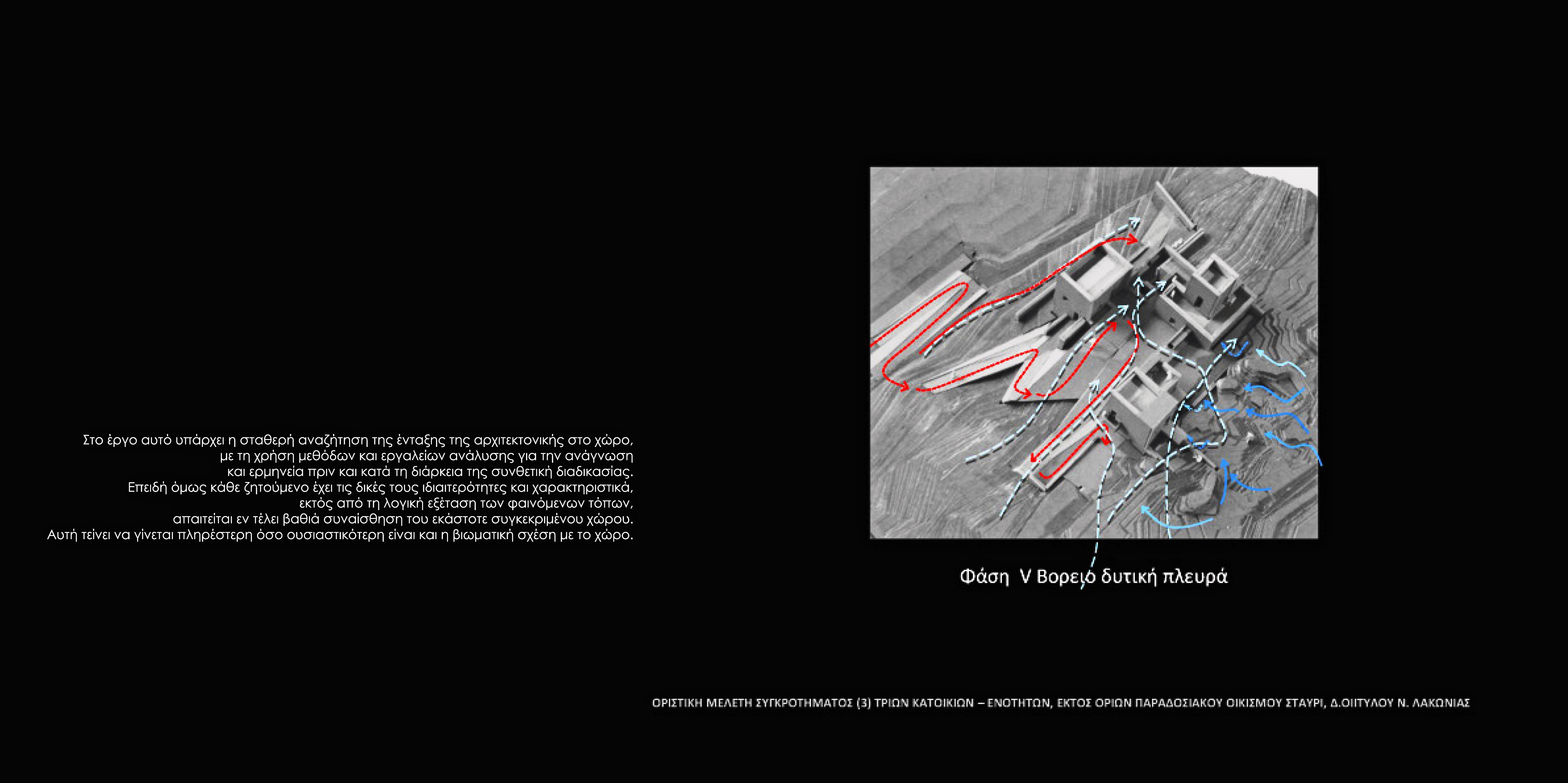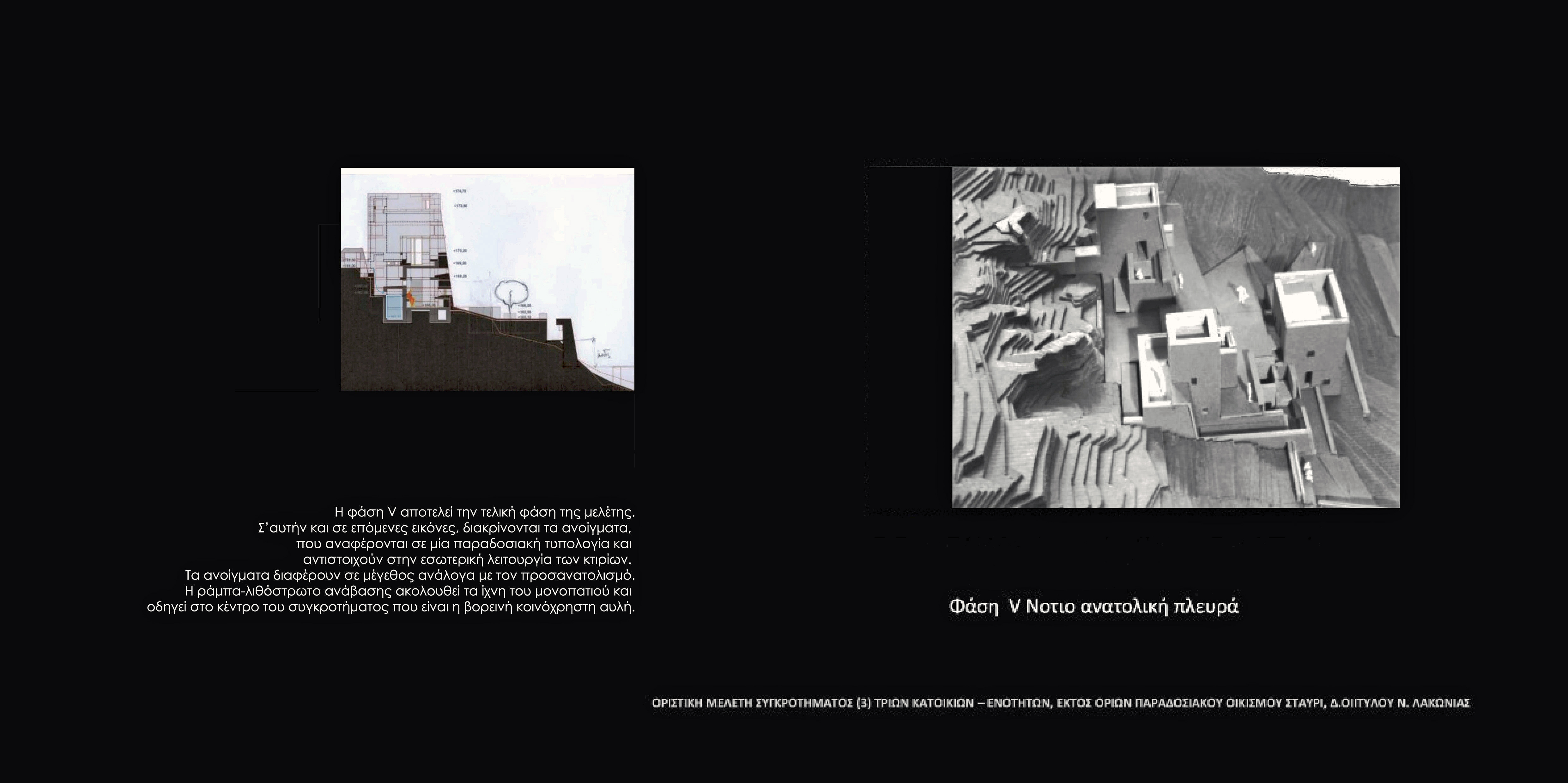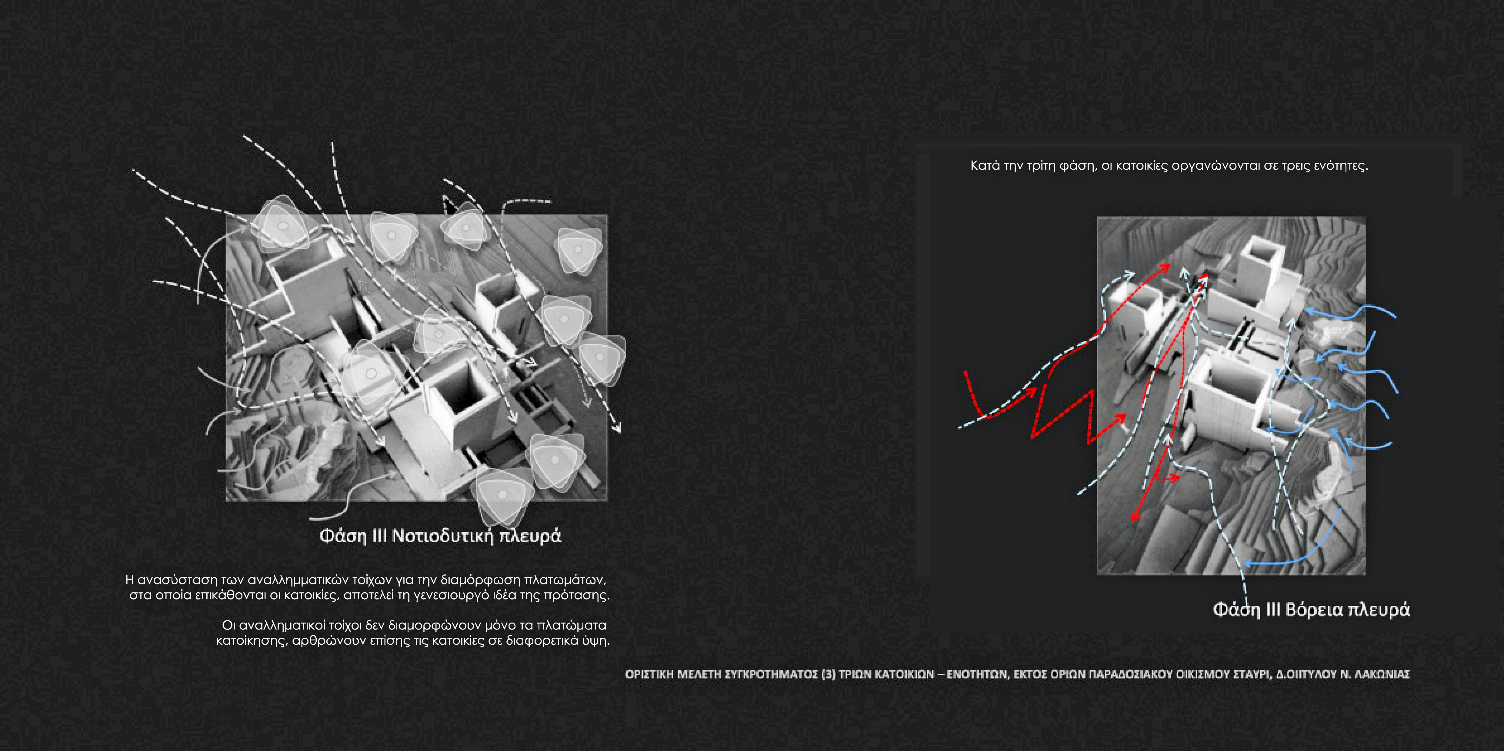 ANALYSIS OF THE BASIC PRINCIPLES OF COMPOSITION In this study the elements of the landscape, natural and artificial (see A3), constitute the elements of the composition. I mean the way in which the analemmatic drystone walls, which form the planting levels, can be reconstituted to form minimum habitation levels in a sloping field. The habitation can be organized on levels, corresponding to the artificial platforms, and divided into internal functional zones, taking advantage of the view towards the olive groves and the wider landscape. General Principles of Composition of the Complex – Architectural Proposal. The architectural design follows the following principles of composition: A. Smooth integration of the complex into the natural and cultural landscape, as well as the elevational curves, so that the complex opens to the view with (NE_ΑSEΝ) orientation. B. Organization of movements and residences around a path and a common open-air meeting place plateau so as to form a social core. C. Autonomy and coexistence of the three units in different flat areas, on either side of the path and the central outdoor space, a square, in order to achieve: Autonomy of the three houses in the living areas and coexistence in the common areas (square and ramp). The architectural proposal. The proposal deals with the above construction principles as follows: A. The smooth integration into the natural landscape is implemented by positioning the complex along the north-south axis and in that part of the plot where the slope allows for differentiation according to ‘height, i.e., placed in the highest area. Thus, access and basic movement to the modules and common areas follow the natural terrain in the traces of the original path with significant elevation differences. The north-south axis penetrates the main outdoor space and offers complex visual contact with the landscape and openness to good orientation and unobstructed views. B. The condensation of all movements and actions is realized by the creation of the path and the small square that form the backbone of the complex and gather the movements and positions in the complex. For the organization and morphology of the complex, I took into account the evolution of the archetypal forms of the area. C. The autonomy and co-existence of the three units is realized as follows: The residences are built autonomously with the individual spaces on three levels and with the structure of the residence on medium levels to better adapt to the strong slope of the ground. The inclusion of the building units in consecutive height platforms, or analemmas, the purpose of which is to ultimately organize the units around the central platform, or square.