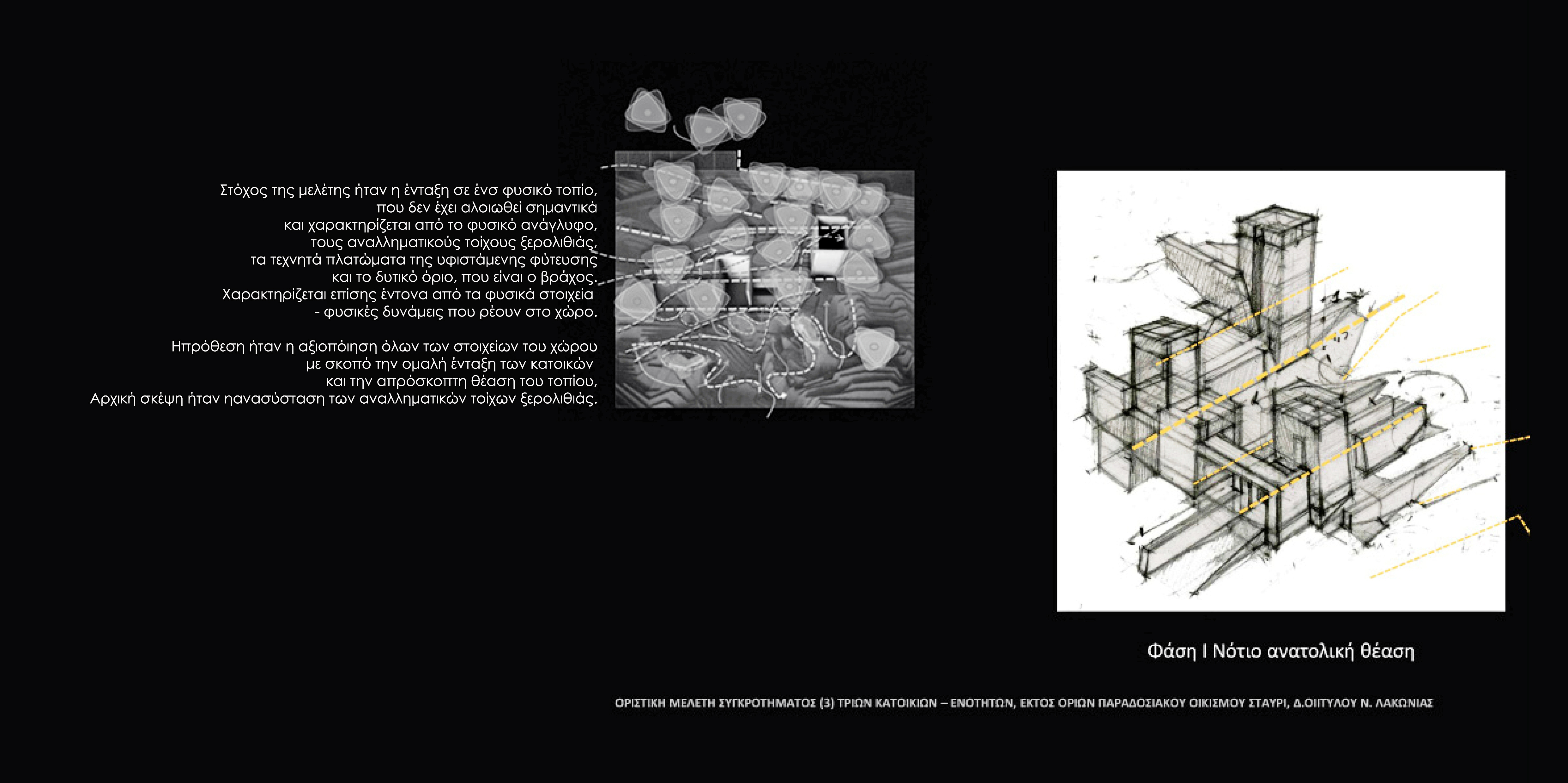 A building complex of (3) residence units. Outside the boundaries of the traditional settlement of Stavri in the eastern Mani, Laconia. Study Architect: Theodoros Psykakos. Construction permit: 09/2011